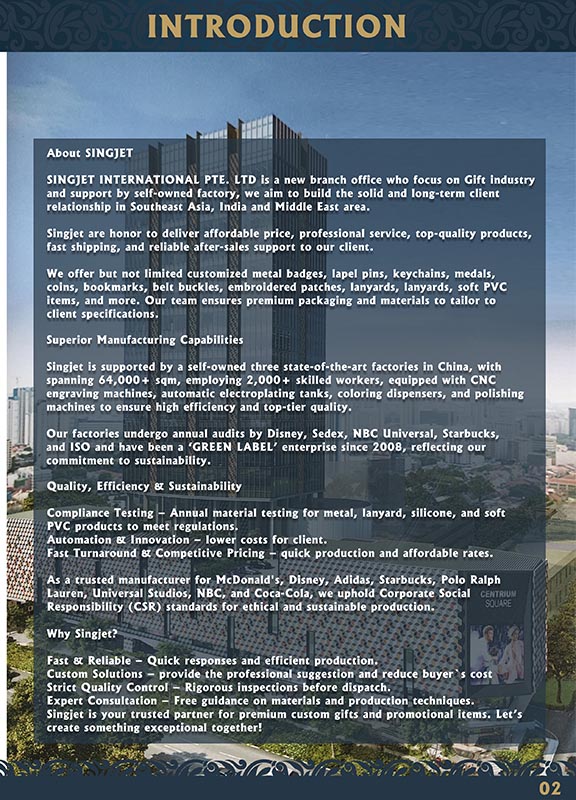 SINGJET INTERNATIONAL PTE. LTD is a new branch office who focus on Gift industry and support by self-owned factory, we aim to build the solid and long-term client relationship in Southeast Asia, India and Middle East area. Singjet are honor to deliver affordable price, professional service, top-quality products,fast shipping, and reliable after-sales support to our client.We offer but not limited customized metal badges, lapel pins, keychains, medals, coins, bookmarks, belt buckles, embroidered patches, lanyards, lanyards, soft PVC items, and more. Our team ensures premium packaging and materials to tailor to client specifications.